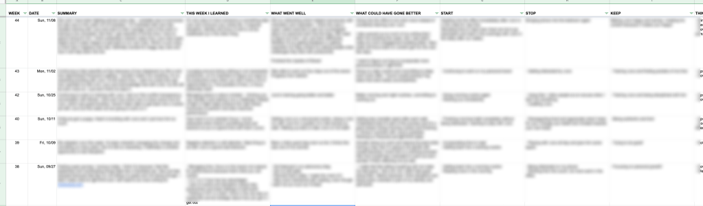 In this weekly reflection screenshotted above, you can see the weekly cadence I set and the answers I give almost every week in the same structured format.